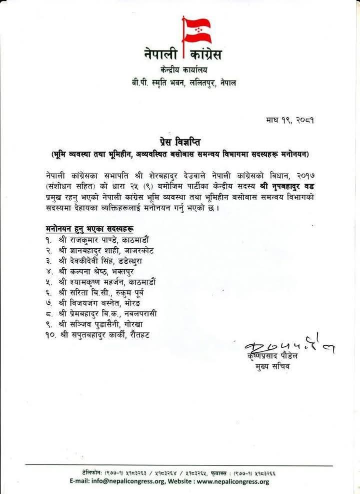 नेपाल । नेपाली कांग्रेसले भूमि व्यवस्था तथा भूमिहीन, अव्यवस्थित बसोबास समन्वय विभागमा १० सदस्य मनोनयन गरेको छ ।