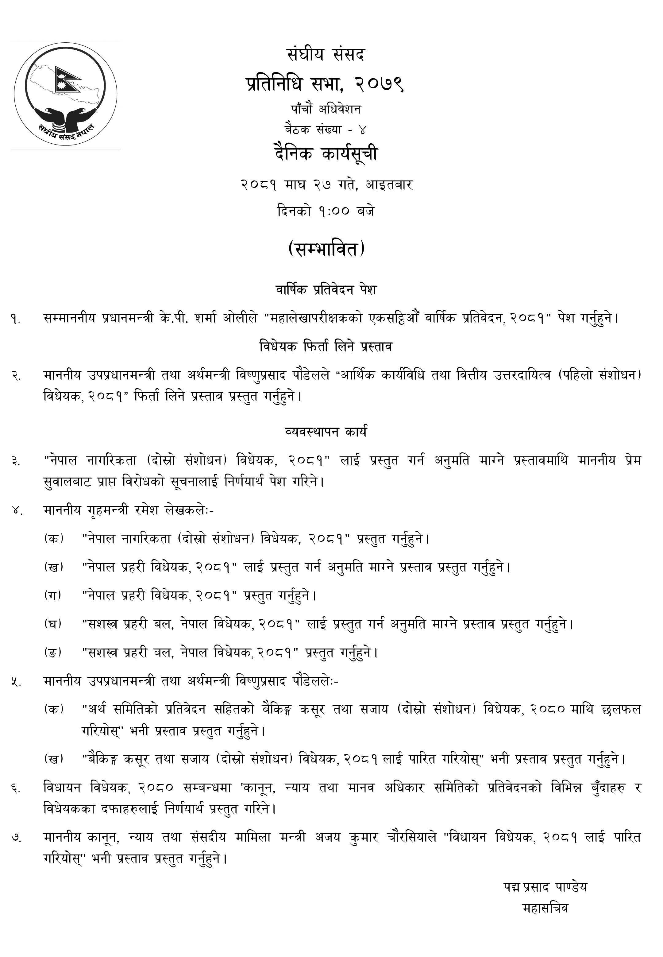 प्रतिनिधि सभा बैठक बस्दै, संभावित कार्यसूची यस्तो छ