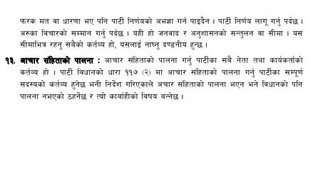 आचारसंहितामा भनिएको छ, ‘पार्टीका आन्तरिक छलफलमा हरेक सदस्यले स्वतन्त्रतापूर्वक पार्टीका हरेक विषयमा बोल्न र मत राख्न पाइन्छ तर पार्टी निर्णयका विरुद्ध आफ्नो पार्टी कमिटीभन्दा बाहिर गएर बोल्न र मत राख्न पाइँदैन । आफ्नो फरक मत वा धारणा भए पनि पार्टी निर्णयको अवज्ञा गर्न पाइँदैन । पार्टी निर्णय लागू गर्नु पर्दछ । अरूका विचारको सम्मान गर्नु पर्दछ । यही हो जनवाद र अनुशासनको सन्तुलन वा सीमा । यस सीमाभित्र रहनु सबैको कर्तव्य हो, यसलाई नाघ्नु दण्डनीय हुन्छ ।’