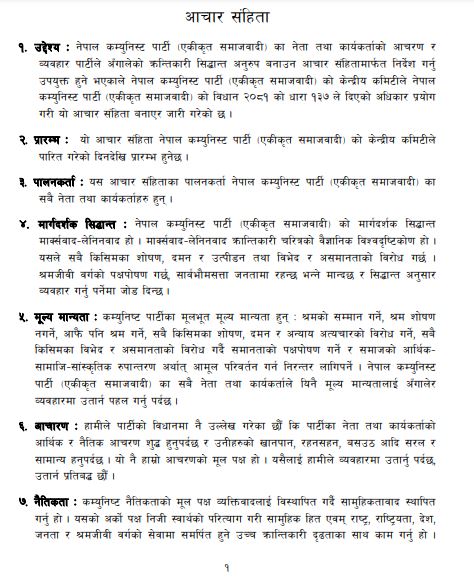 आचारसंहितामा भनिएको छ, ‘पार्टीका आन्तरिक छलफलमा हरेक सदस्यले स्वतन्त्रतापूर्वक पार्टीका हरेक विषयमा बोल्न र मत राख्न पाइन्छ तर पार्टी निर्णयका विरुद्ध आफ्नो पार्टी कमिटीभन्दा बाहिर गएर बोल्न र मत राख्न पाइँदैन । आफ्नो फरक मत वा धारणा भए पनि पार्टी निर्णयको अवज्ञा गर्न पाइँदैन । पार्टी निर्णय लागू गर्नु पर्दछ । अरूका विचारको सम्मान गर्नु पर्दछ । यही हो जनवाद र अनुशासनको सन्तुलन वा सीमा । यस सीमाभित्र रहनु सबैको कर्तव्य हो, यसलाई नाघ्नु दण्डनीय हुन्छ ।’