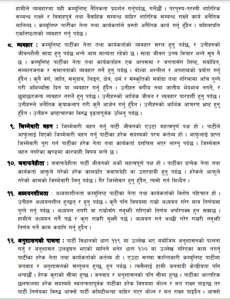 पार्टीका नेता तथा कार्यकर्ताको आर्थिक र नैतिक आचरण शुद्ध हुनुपर्ने उल्लेख छ । नेता कार्यकर्ताको खानपान, रहनसहन, बस उठ सरल र सामान्य हुनुपर्नेछ।