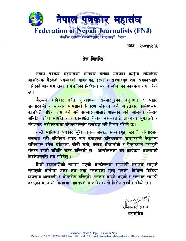बैठकले पत्रकार रजकको हत्या तथा सञ्चारगृह तथा पत्रकारमाथि गरिएको आक्रमण तथा आगजनीको विरोधमा थप आन्दोलनका कार्यक्रम तय गरेको महासचिव रामप्रसाद दाहालद्वारा जारी विज्ञप्तिमा उल्लेख छ ।