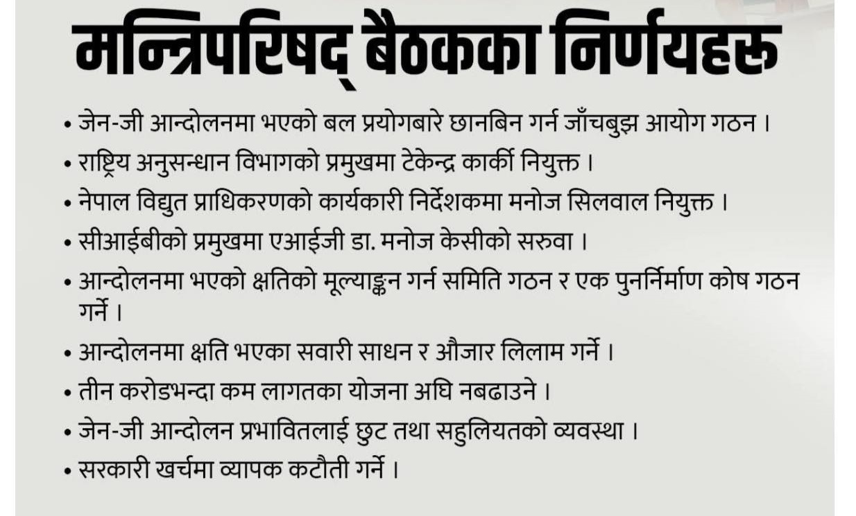 नेपाल । सरकारले जेनजी आन्दोलनका क्रममा भदौ २३ र २४ गतेको घटनाबारे अनुसन्धानका लागि उच्चस्तरीय न्यायिक जाँचबुझ आयोग गठन गरेको छ।