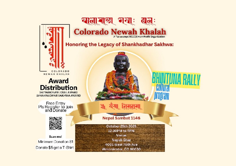 -नातिबाबु भट्ट (कोलोराडो, अमेरिका) । नेपाल सम्वत ११४६ को अवसरमा नेवाः खलः कोलोराडोले सिष्टर्स ग्रुप दिदीबहिनी समुह कोलोराडो र बरिष्ठ गायक तथा संगीतकार हिरण्य भोजपुरेलाइ पुरस्कृत गर्ने भएको छ । आगामी अक्टोवर २५ तारिक शनिबार नेपाली सांस्कृतिक केन्द्र नेपाली घरमा आयोजना गर्नलागेको न्हूदँया भिन्तुना कार्यक्रममा उक्त पुरस्कार बितरण गर्ने बताइएको छ ।