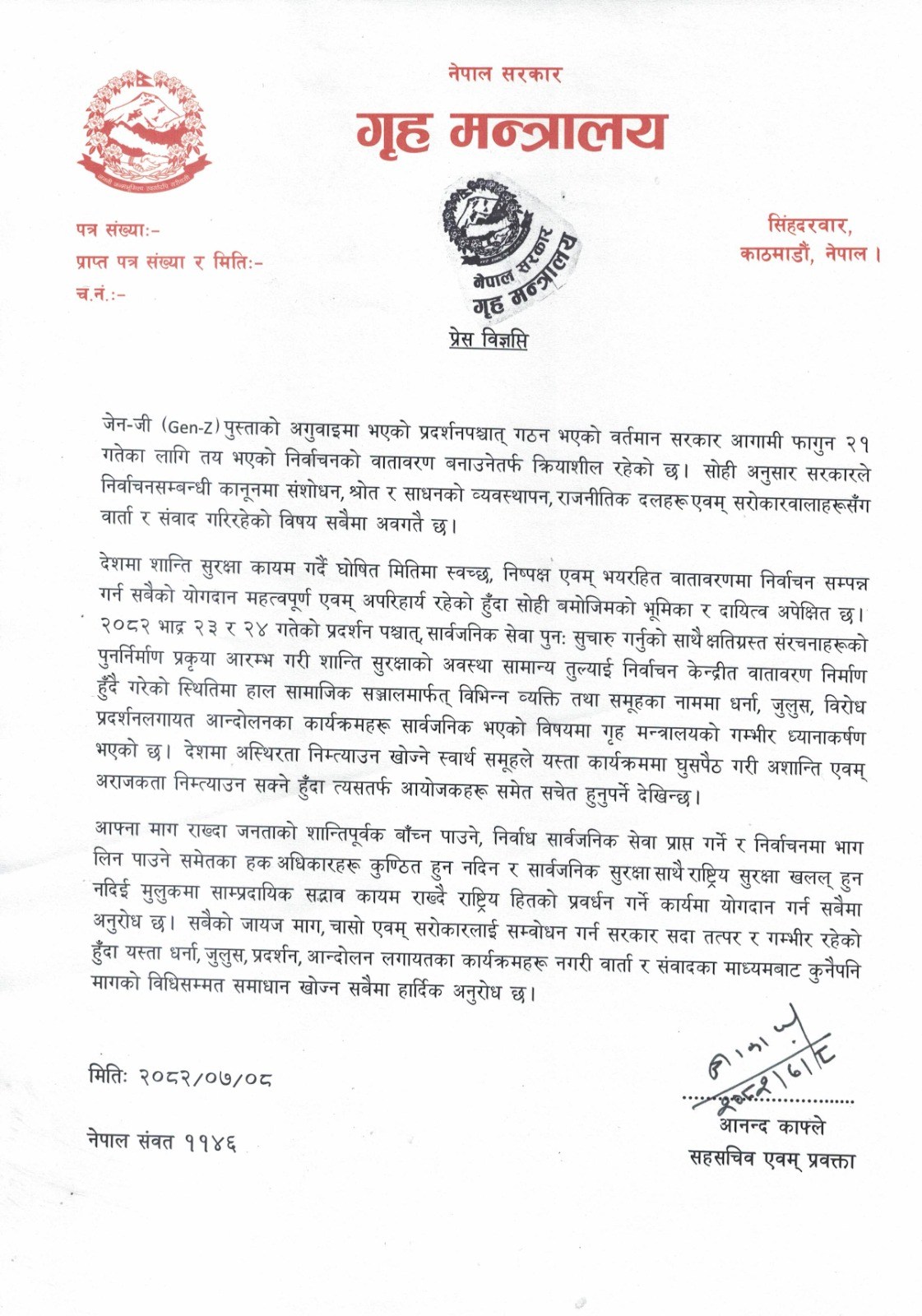 गृह मन्त्रालयका सहसचिव एवम् प्रवक्ता आनन्द काफ्लेले विज्ञप्ति जारी गर्दै घुसपैठ भएर सुरक्षा र चुनाव बिथोलिने चिन्ता व्यक्त गर्दै धर्ना र जुलुस नगर्न अपिल गरेको हो।