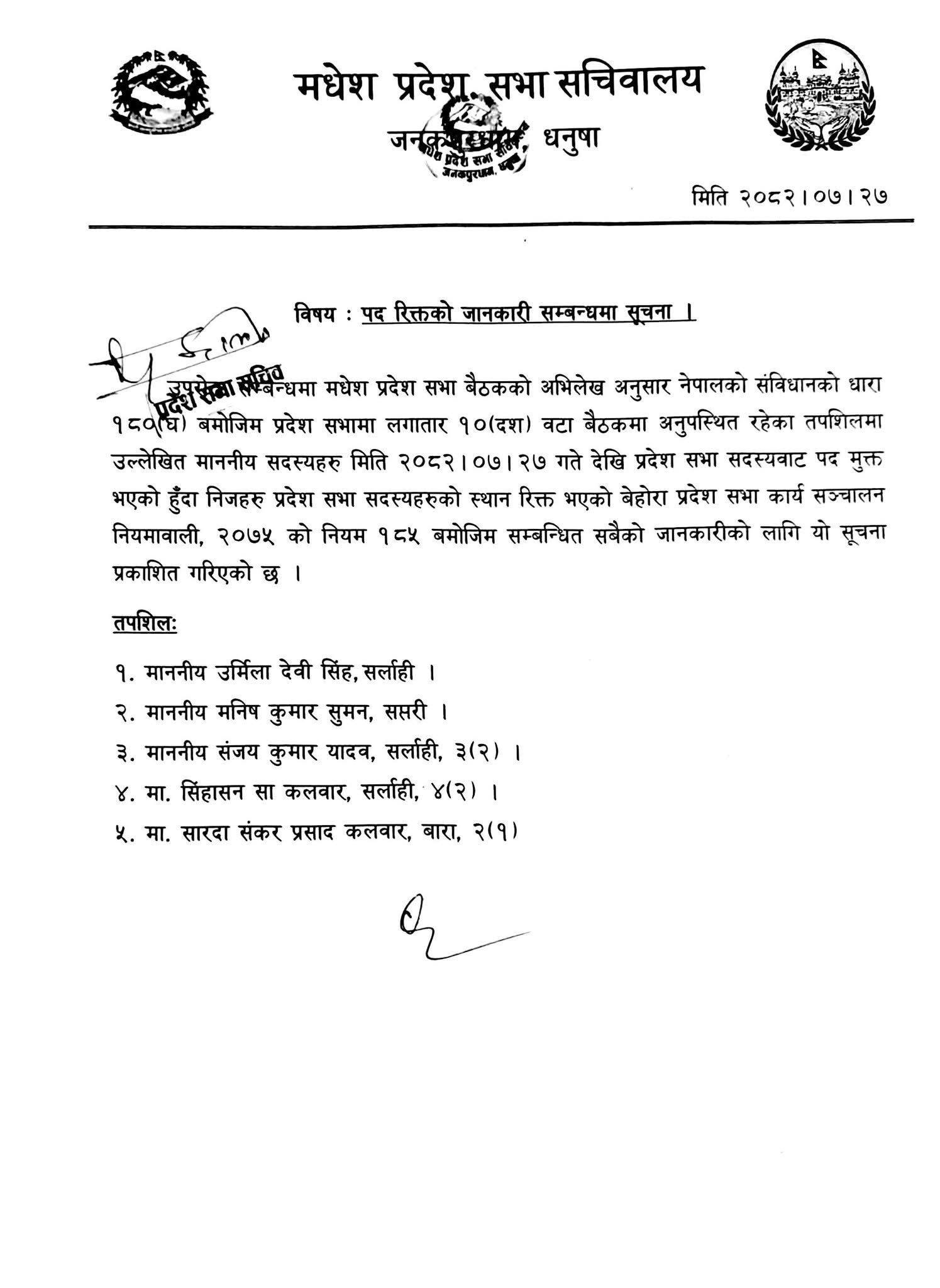 प्रदेशसभा सचिवालयद्वारा जारी सूचनामा नेपालको संविधानको धारा १८० (घ) र प्रदेशसभा कार्यसञ्चालन नियमावली, २०७५ को नियम १८५ बमोजिम पाँचै प्रदेशसभा सदस्यहरूको पद स्वतः रिक्त भएको जनाएको छ ।