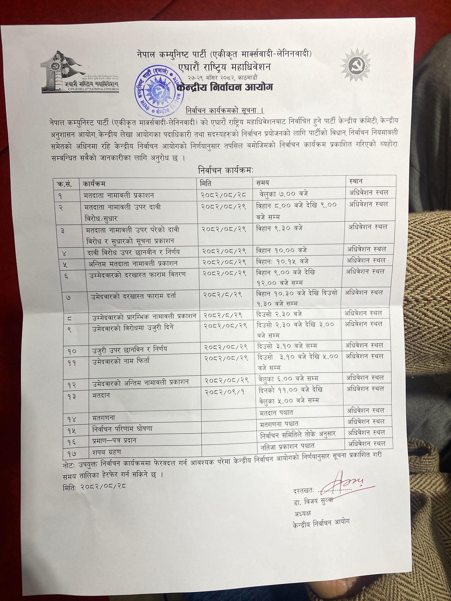 नेपाल । नेकपा एमालेको जारी ११ औं महाधिवेशनमा सोमबार बिहान ८ बजेबाट भृकुटी मण्डपमा सुरु हुँदैछ । पार्टीको निर्वाचन आयोगले आइतबार साँझ प्रकाशन गरेको मतदाताको अन्तिम नामावलीमा अहिले बिहान ९ बजेसम्म दाबी विरोधको समय राखिएको छ ।