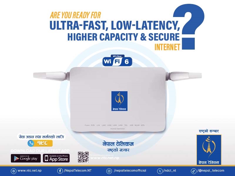 नेपाल । नेपाल टेलिकमले वाइफाई सिक्स राउटर उपलब्ध गराउने भएको छ । कम्पनीले उपलब्ध गराइरहेको फाइबर टु दी होम (एफटिटिएच) प्रविधिको इन्टरनेटलाई अझ गुणस्तरीय बनाउन यस किसिमको वाइफाई र एपी उपलब्ध गराउने जनाएको छ । यस अन्तर्गत न्यूनतम एक सय एमबिपिएस क्षमताको एफटिटिएच वितरण हुने कम्पनीले जानकारी दिएको छ ।