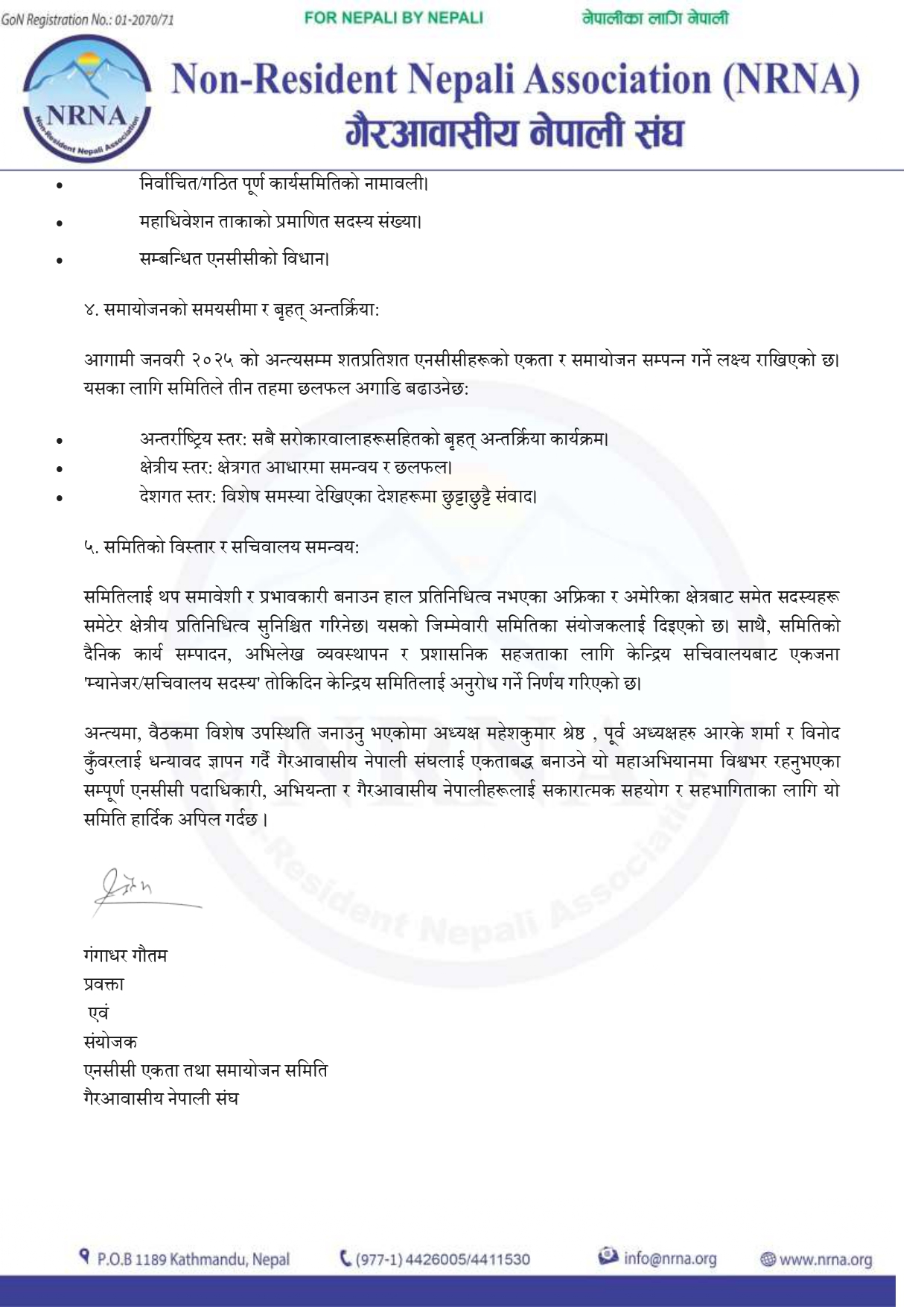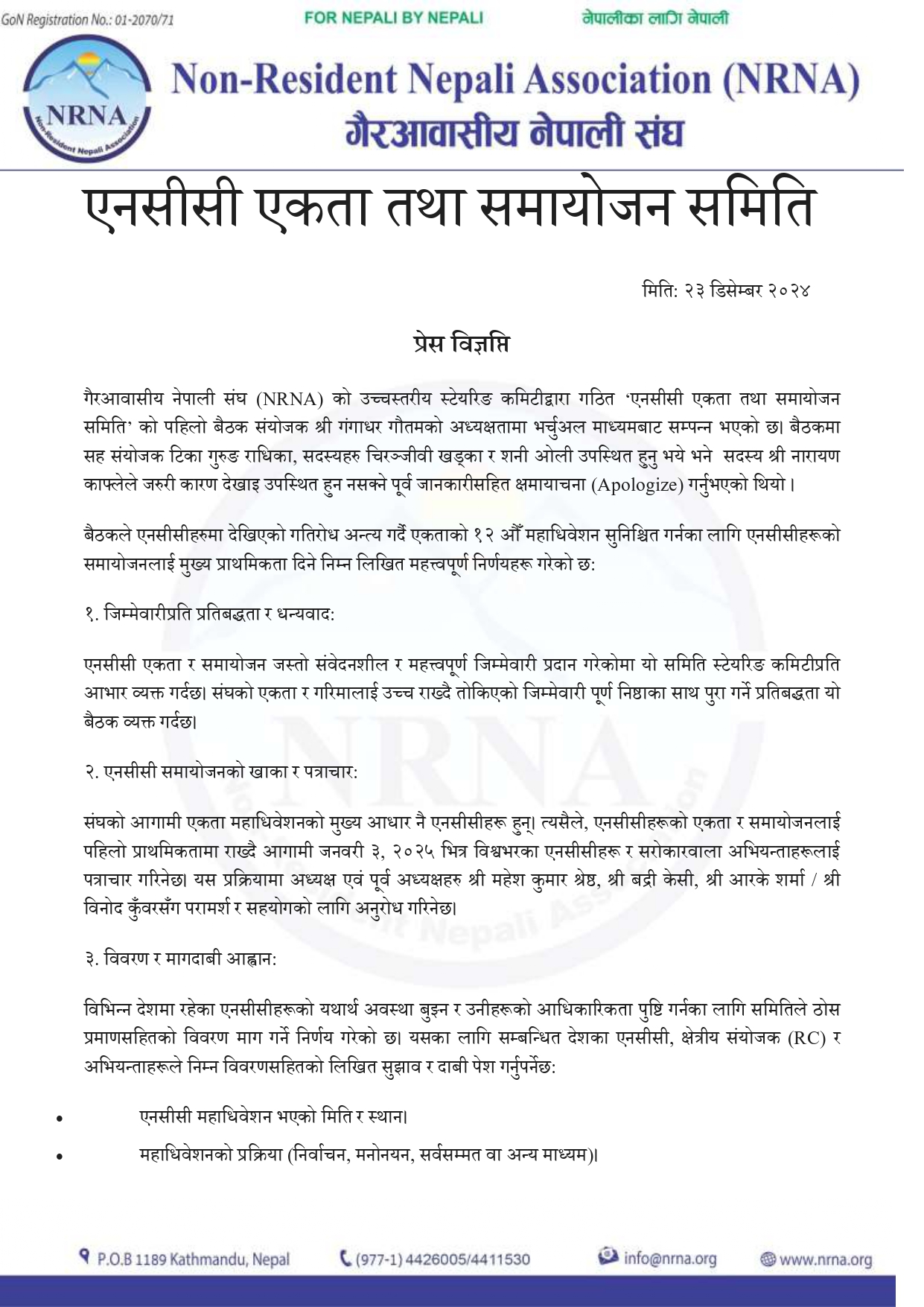 एनआरएनए एनसीसी एकता तथा समायोजन समितिको पहिलो बैठकमा के के निर्णय भयो ? (प्रेस विज्ञप्ति)