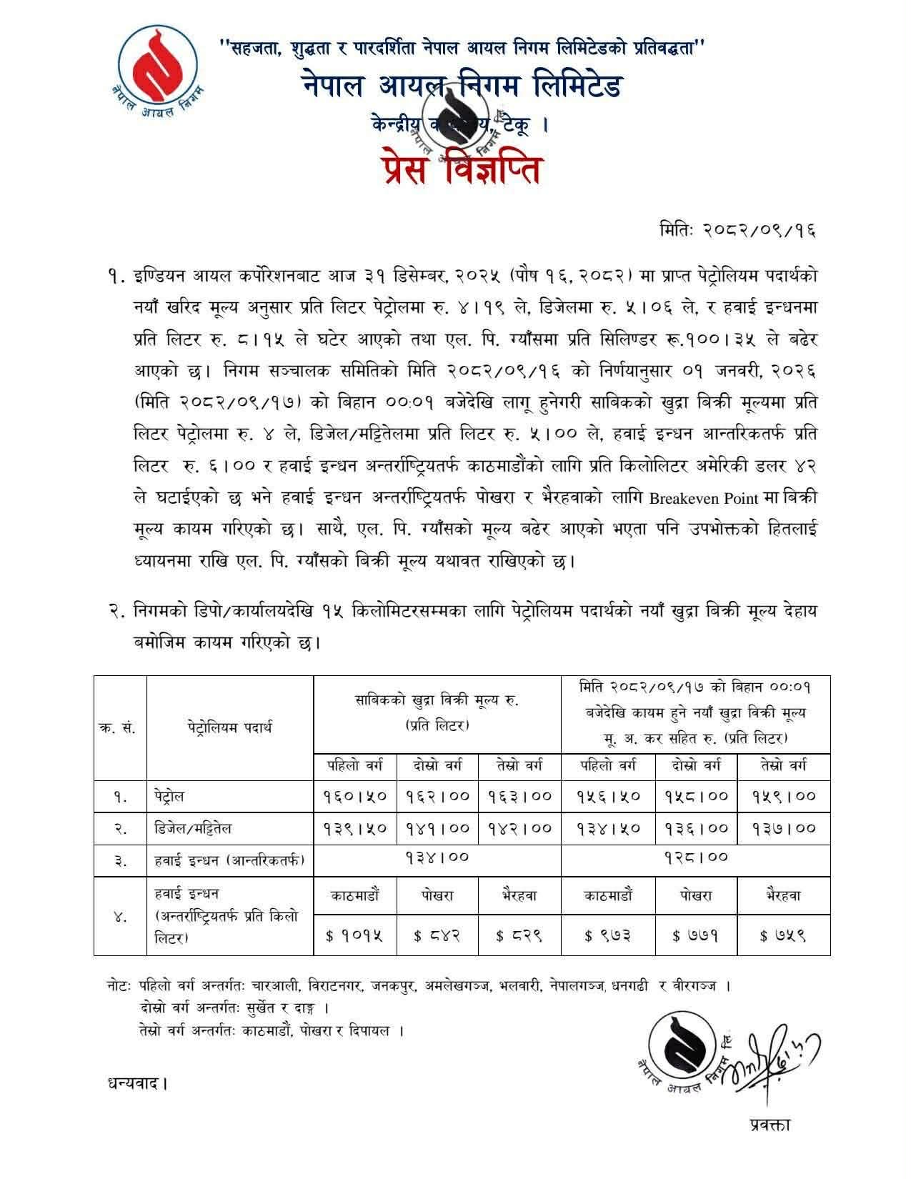 नयाँ मूल्यअनुसार पेट्रोल प्रतिलिटर चार रुपियाँ, डिजेल र मट्टितेल प्रतिलिटर पाँच रुपियाँले घटाइएको छ । आन्तरिक हवाई इन्धनमा प्रतिलिटर छ रुपियाँ र अन्तर्राष्ट्रिय उडानतर्फ काठमाडौँका लागि प्रतिकिलोलिटर अमेरिकी डलर ४२ ले मूल्य घटाइएको छ ।
