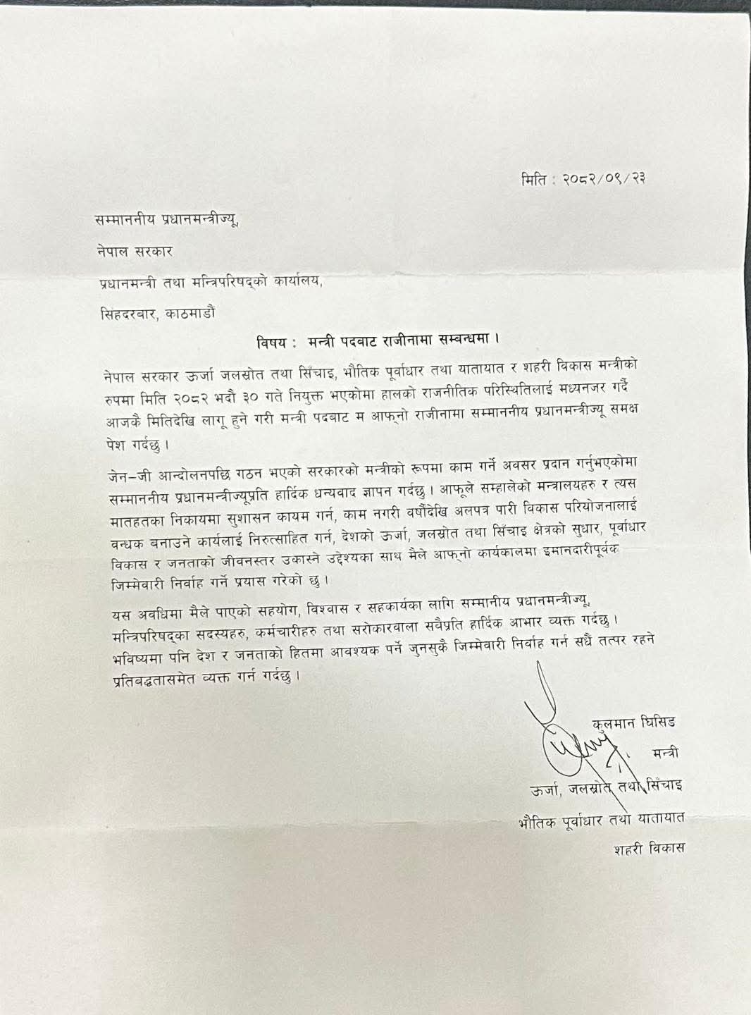 नेपाल । ऊर्जा, जलस्रोत तथा सिँचाइमन्त्री कुलमान घिसिङले बुधबार राति राजीनामा दिएका छन् ।