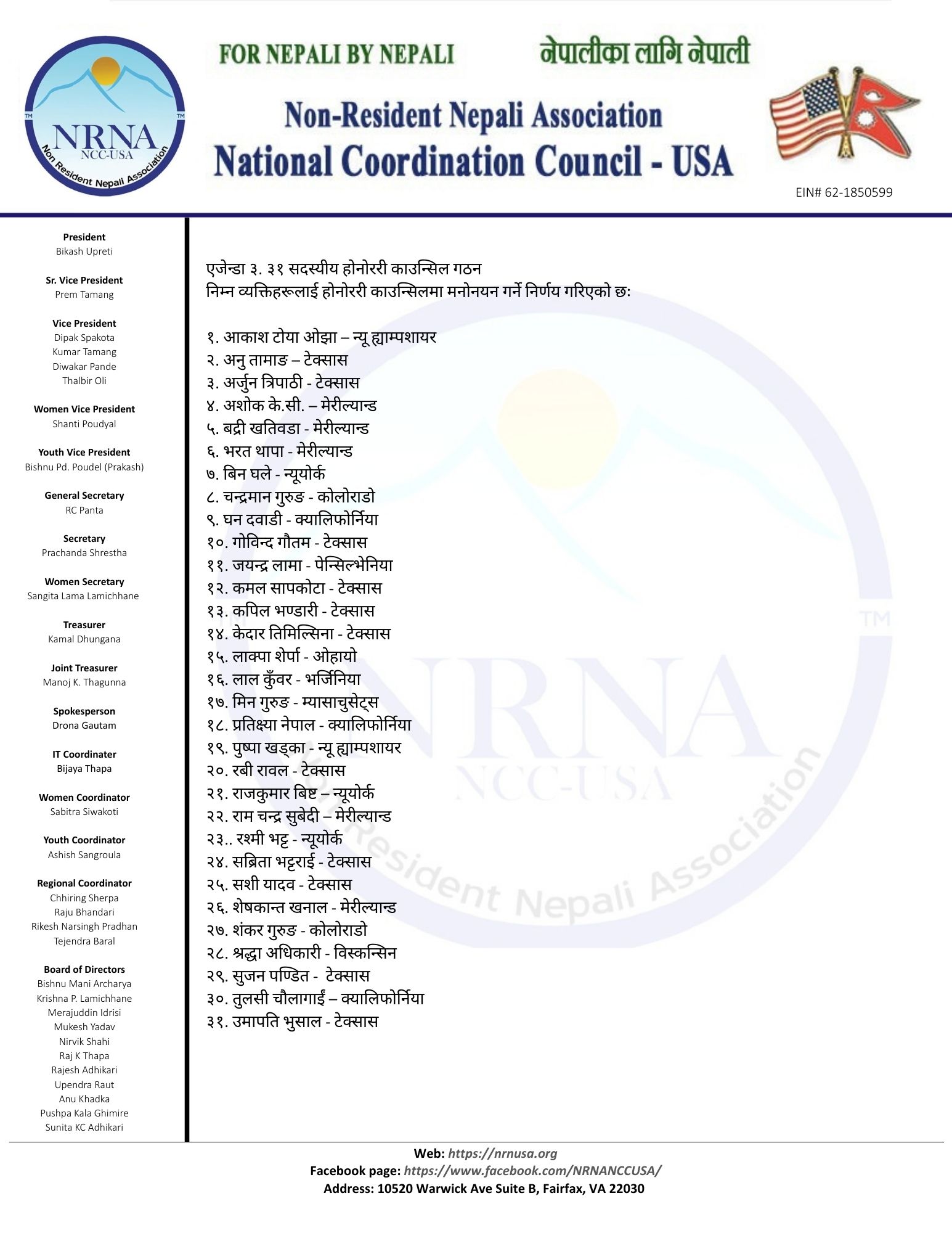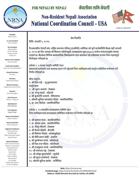 यही ४ जनवरीमा अध्यक्ष विकास उप्रेतीको अध्यक्षमा सम्पन्न जूम बैठकबाट उक्त निर्णय गरिएको हो । बैठकबाट नियुक्त सबै सल्लाहकारहरु र मानार्थ बोर्ड सदस्यहरुलाई एनआरएनए एनसीसी अमेरिकाले बधाइ ज्ञापन गरेको छ ।