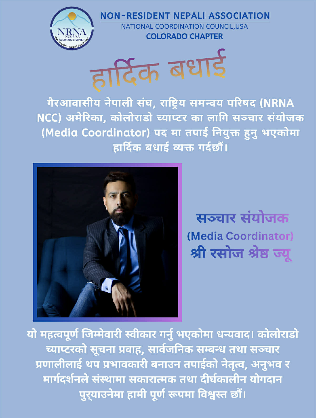 त्यसैगरी, कोलोराडो च्याप्टरको सूचना प्रवाह, सार्वजनिक सम्बन्ध तथा सञ्चार प्रणालीलाई थप प्रभावकारी बनाउने उद्देश्यका साथ मिडिया संयोजक पदमा रसोज श्रेष्ठलाई मनोनयन गर्ने निर्णय गरिएको छ ।