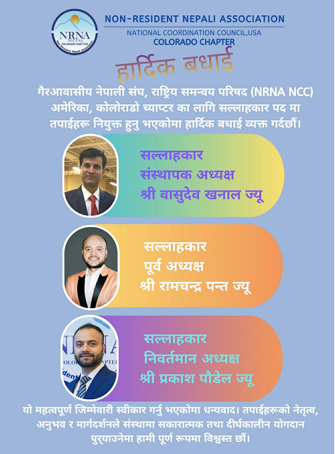 गैरआवासीय नेपाली संघ (NRNA) अमेरिका, कोलोराडो च्याप्टर नेपाली समुदायको हित, एकता तथा संस्थागत विकासका लागि निरन्तर क्रियाशील रहने प्रतिबद्धता व्यक्त गर्दछ ।