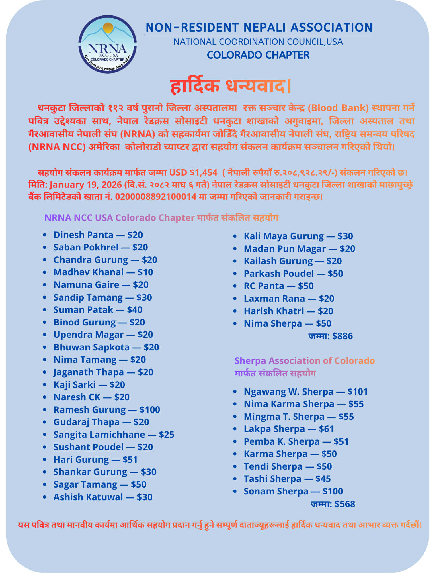 सहयोग संकलनमा NRNA NCC USA कोलोराडो च्याप्टर मार्फत USD $886 र Sherpa Association of Colorado मार्फत USD $568 रकम संकलन भएको हो ।