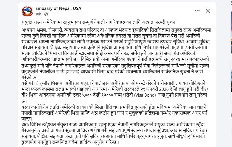 संयुक्त राज्य अमेरिकामा रहनुभएका सम्पूर्ण नेपाली नागरिकहरूका लागि अत्यन्त जरूरी सूचना