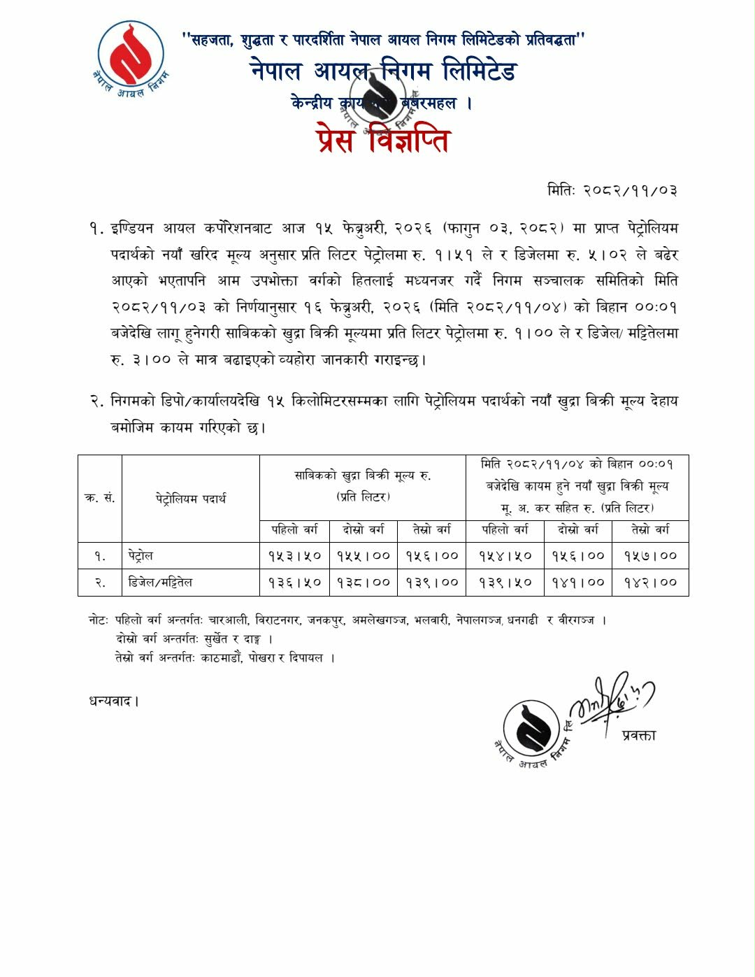 कोलोराडोखबर संवाददाता , February 16th, 2026 नेपाल । नेपालमा पेट्रोलियम पदार्थको मूल्य समायोजन भएको छ । नेपाल आयल निगमले सोमबारदेखि लागू हुने गरी पेट्रोल, डिजल र मट्टीतेलको मूल्य समायोजन गरेको हो । निगमका अनुसार पेट्रोलमा प्रतिलिटर रु एक, डिजल र मट्टीतेलमा प्रतिलिटर रु तीनले मूल्य बढेको छ । प्रतिक्रिया दिनुहोस्
