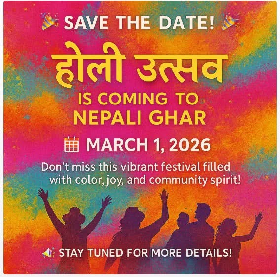 नेपालीहरुको साझा संस्था नेपाली घरको आयोजनामा आगामी मार्च १ तारिक आइतबारका दिन दिउसो १ बजे देखी ४ बजे सम्म नेपाली सांस्कृतीक केन्द्र नेपाली घरमा होली खेल्ने कार्यक्रम रहेको नेपाली घरका अध्यक्ष बसन्त लम्सालले बताएका छन् ।