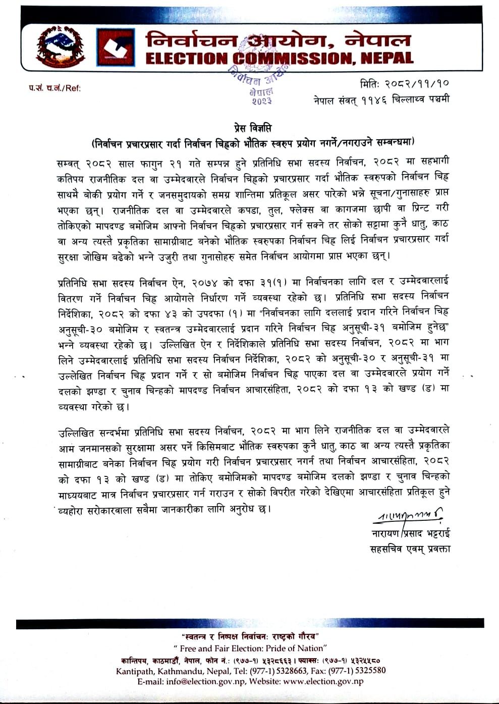 आयोगले आइतबार विज्ञप्ति जारी गर्दै काठ, फलाम वा अन्य सामग्रीबाट बनेका भौतिक निर्वाचन चिह्न प्रयोग गर्दा सुरक्षामा असर पर्न सक्ने गुनासा प्राप्त भएको जनाएको छ। आयोगका अनुसार कानुनले तोकेको मापदण्डअनुसार मात्र दलको झण्डा र कागजमा छापिएको निर्वाचन चिह्न प्रयोग गर्न पाइनेछ।