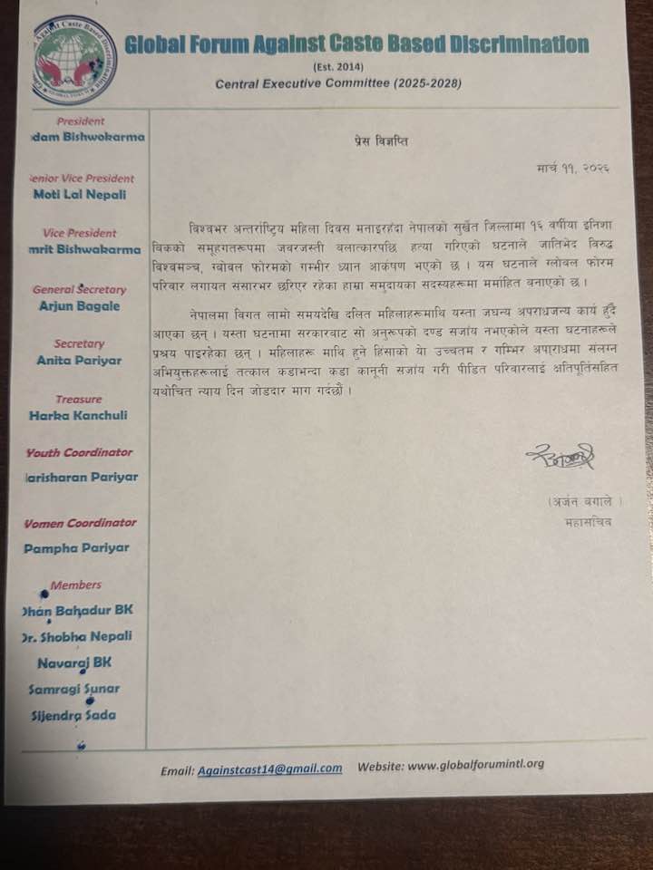 ‘नेपालमा विगत लामो समयदेखि दलित महिलाहरूमाथि यस्ता जघन्य अपराधजन्य कार्य हुँदै आएका छन् । यस्ता घटनामा सरकारबाट सो अनुरूपको दण्ड सजाँय नभएकोले यस्ता घटनाहरूले प्रश्रय पाइरहेका छन् । महिलाहरू माथि हुने हिंसाको यो उच्चतम र गम्भिर अपा्राधमा संलग्न अभियुक्तहरूलाई तत्काल कडाभन्दा कडा कानूनी सजाँय गरी पीडित परिवारलाई क्षतिपूर्तिसहित यथोचित न्याय दिन जोडदार माग गर्दछौं ।’, विज्ञप्तिमा उल्लेख छ ।