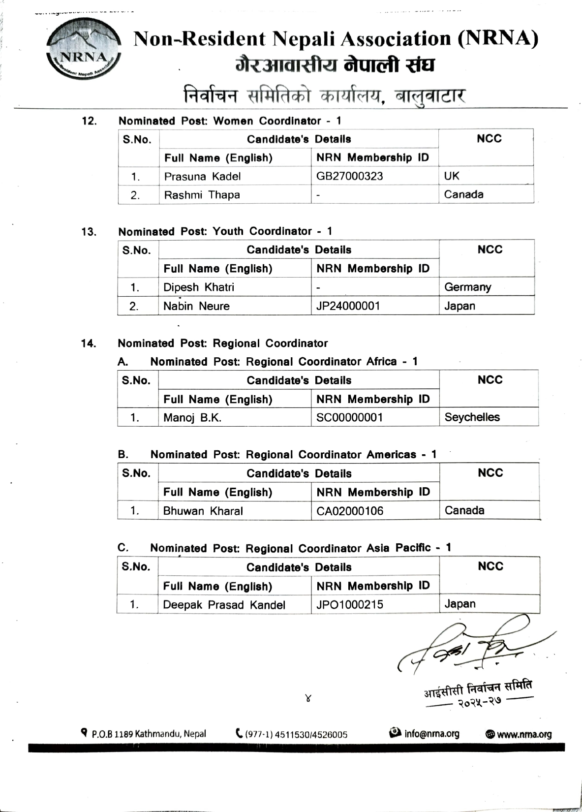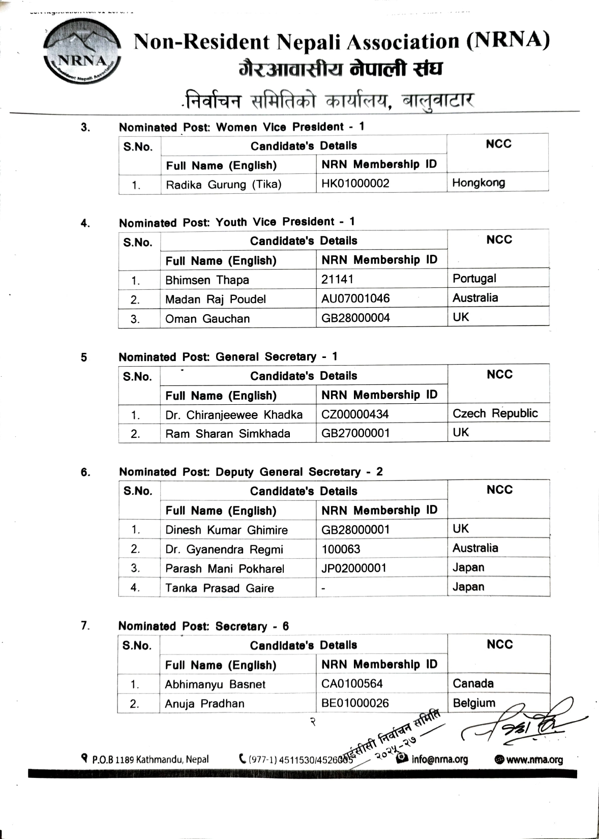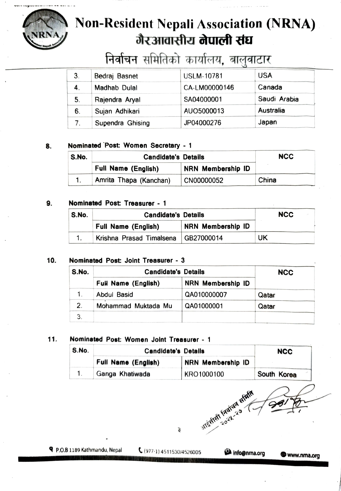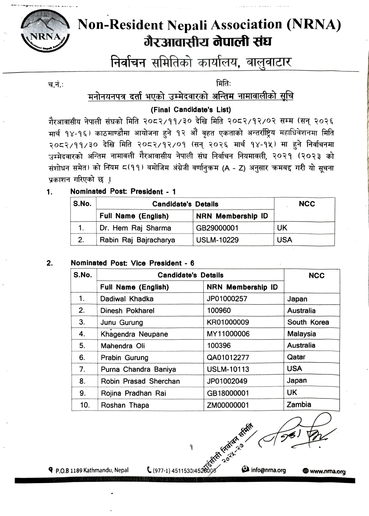 अमेरिका । गैरआवासीय नेपाली संघ (एनआरएनए) को अध्यक्षका प्रत्याशी रोविन शेरचनले यसअघि दर्ता गराएको अध्यक्ष पदको उम्मेदवारी फिर्ता लिएका छन् ।
