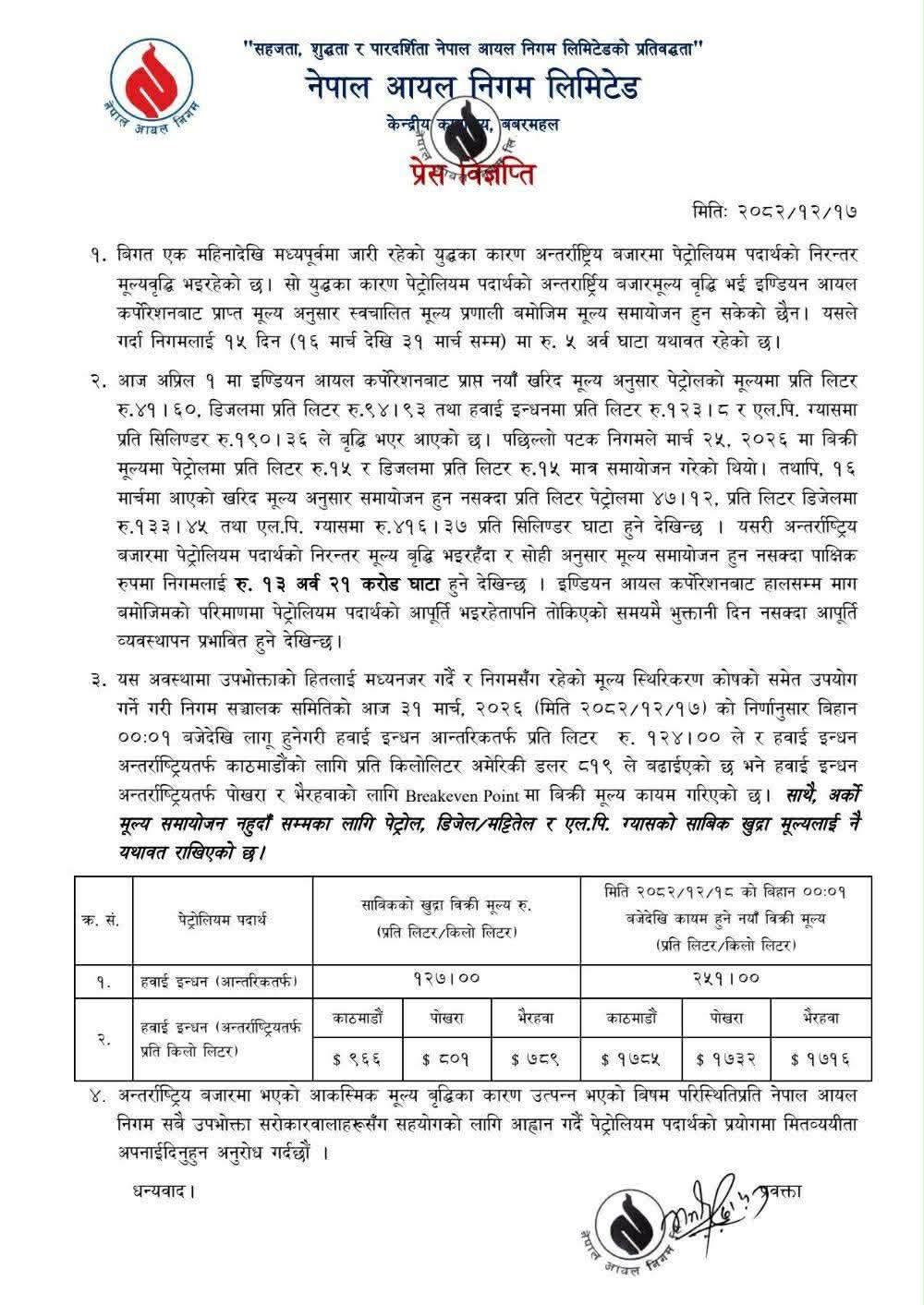 भारतबाट यति ठूलो मात्रामा मूल्य बढेर प्राप्त भए तापनि नेपाल आयल निगमले भने तत्कालका लागि नेपाली बजारमा मूल्य नबढाउने निर्णय गरेको छ ।