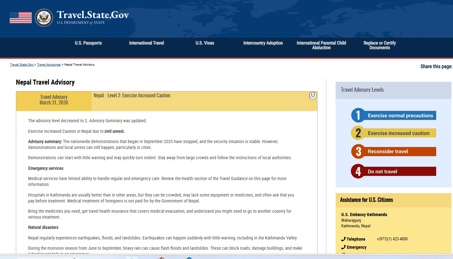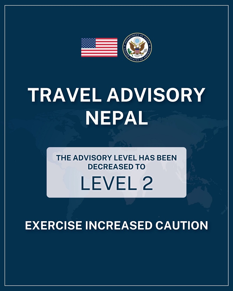 नेपाल । संयुक्त राज्य अमेरिकाले नेपालका लागि जारी गर्दै आएको यात्रा मार्गनिर्देशन (ट्राभल एडभाइजरी) मा सुधार गर्दै सतर्कताको तह घटाएको छ । सन् २०२५ सेप्टेम्बरदेखि सुरु भएको देशव्यापी प्रदर्शनहरू साम्य भई सुरक्षा अवस्था स्थिर बनेपछि अमेरिकाले आफ्नो नागरिकका लागि ‘एडभाइजरी’ अपडेट गरेको हो ।