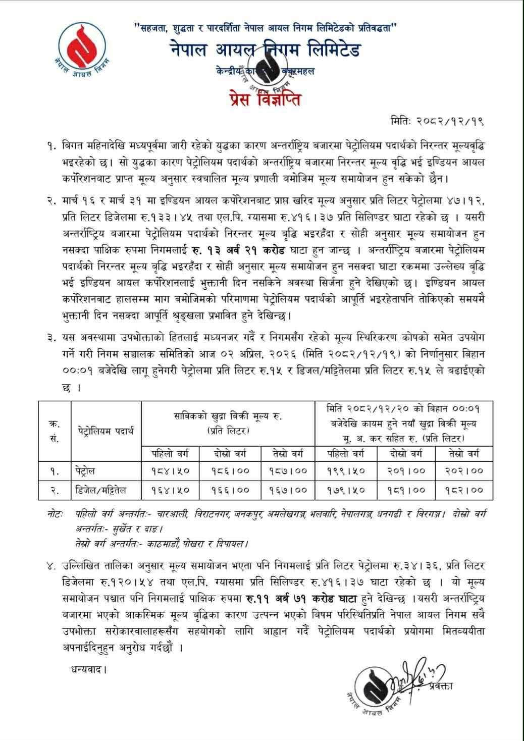नेपाल । नेपाल आयल निगमले बिहीबार पेट्रोलियम पदार्थको मूल्य फेरि वृद्धि गरेको छ । पेट्रोल, डिजेल र मट्टीतेलमा प्रतिलिटर १५ रुपैयाँले वृद्धि गरिएको निगमले जनाएको छ ।