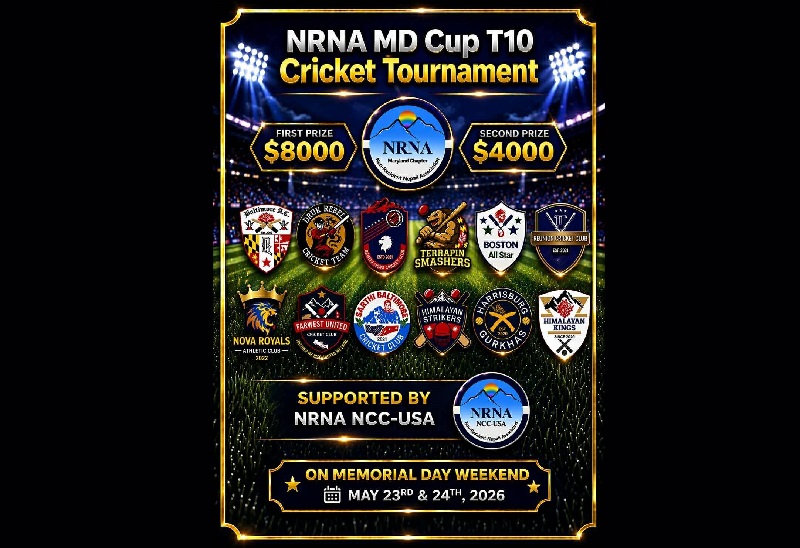 वाल्टिमोर । गैर आवासीय नेपाली संघ, अमेरिका मेरिल्याण्ड राज्य समितिको आयोजनामा एनआरएनए एमडी कप टि टेन क्रिकेट प्रतियोगिता हुने भएको छ । समितिले यही मे को २३ र २४ मा प्रतियोगिता गर्न लागेको च्याप्टर अध्यक्ष बाबुराम भट्टराईले जानकारी दिए ।
