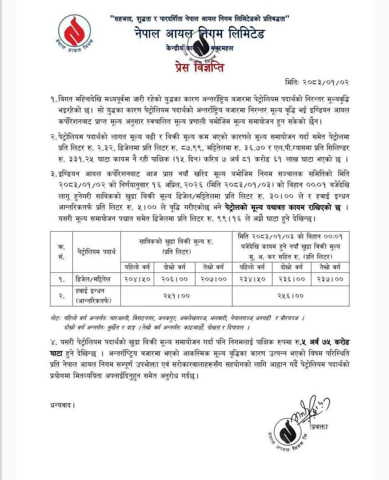 बुधबार सूचना जारी गर्दै मध्य रातिबाट लागू हुने गरी मूल्यवृद्धि गरिएको निगमले जनाएको हो ।