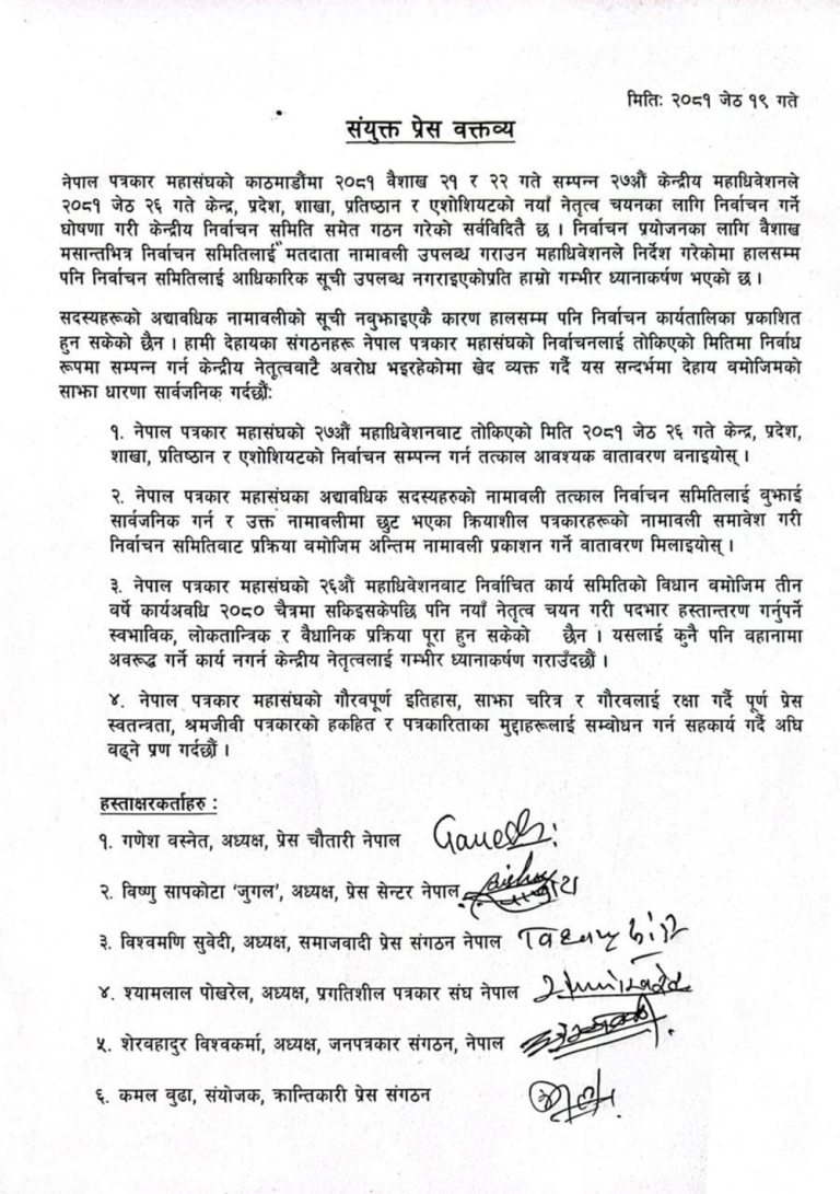 महासंघको नेतृत्वले सदस्यता सूची बुझाउन ढिलाइ गरेको भन्दै प्रेस चौतारी नेपाल, प्रेस सेन्टर नेपाल, समाजवादी प्रेस संगठन नेपाल, प्रगतिशील पत्रकार संघ नेपाल, जनपत्रकार संगठन नेपाल र क्रान्तिकारी प्रेस संगठनले शनिबार संयुक्त विज्ञप्ति जारी गरी यस्तो माग गरेका हुन ।
