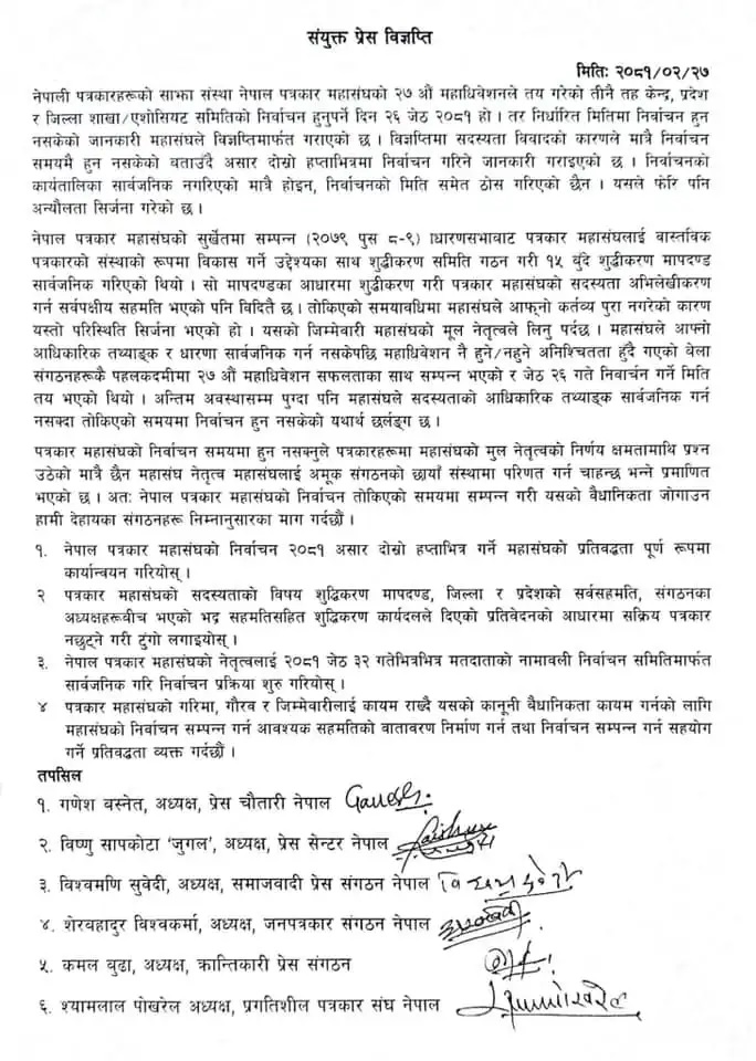 प्रेस चौतारी नेपाल, प्रेस सेन्टर नेपाल, समाजवादी प्रेस संगठन, जनपत्रकार संगठन, क्रान्तिकारी प्रेस संगठन र प्रगतिशील पत्रकार संघले संयुक्त विज्ञप्ति जारी गर्दै महासंघको निर्वाचन मिति तोकेर समयमे निर्वाचन सम्पन्न गरी वैधानिकता जोगाउन ४ बुँदे बटमलाइन पनि सार्वजनिक गरेका छन् ।