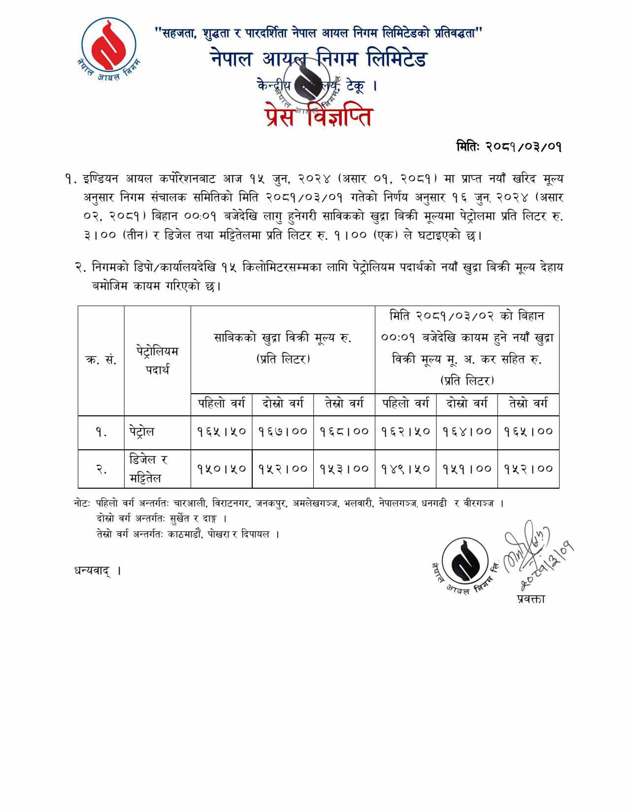इन्डियन आयल कर्पोरेसनबाट जुन १५ अर्थात असार १ गते प्राप्त नयाँ खरिद मूल्यअनुसार निगमले नेपालमा पनि मूल्य घटाएको जनाएको छ ।