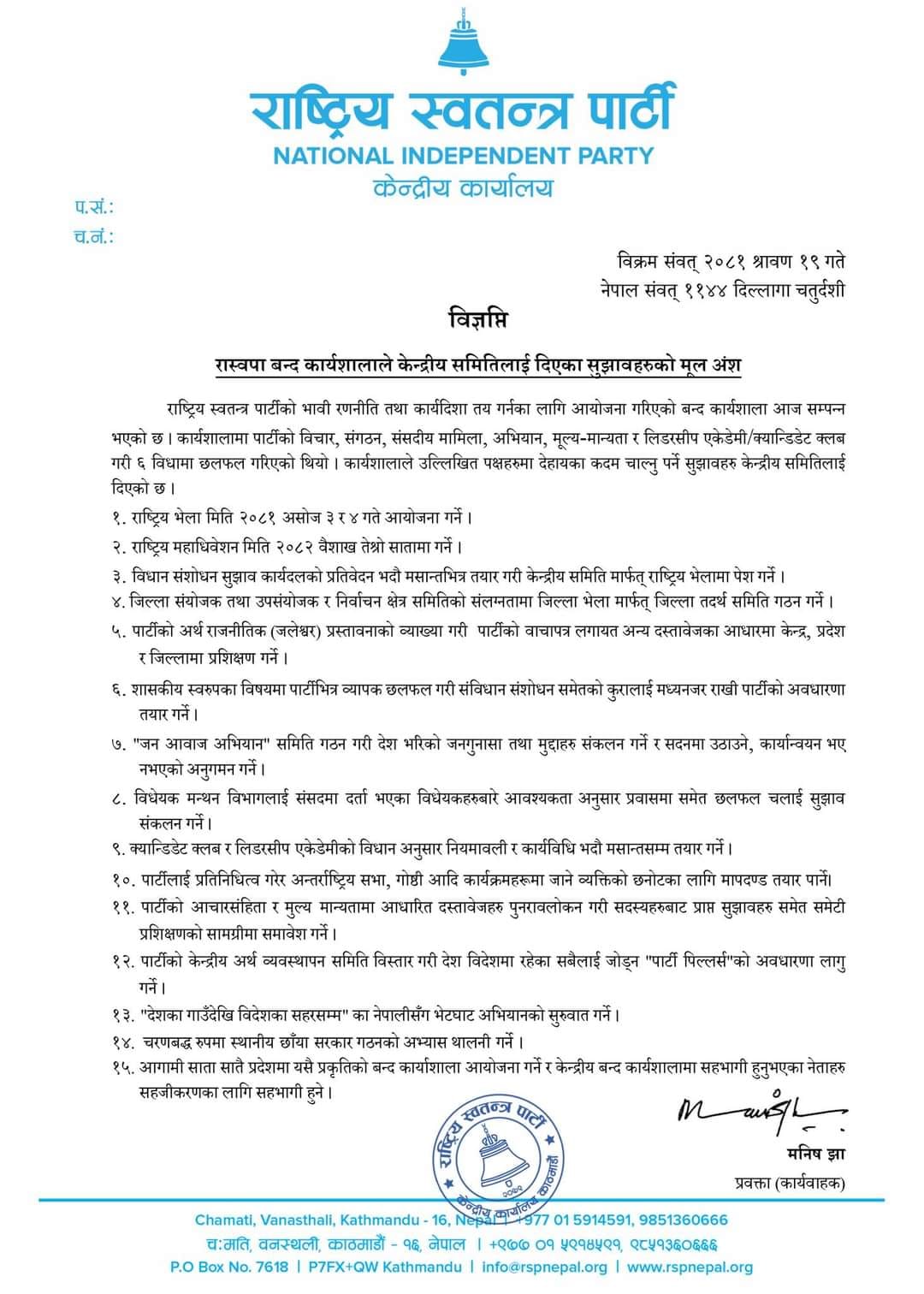 पार्टीको भावी रणनीति तथा कार्यदिशा तय गर्नका लागि शुक्रबार र शनिबार आयोजना गरिएको बन्द कार्यशाला पछि उक्त निर्ण गरिएको हो । कार्यशालामा पार्टीको विचार, सङ्गठन, संसदीय मामिला, अभियान, मूल्यमान्यतालगायत छ विधामा छलफल भएको थियो ।
