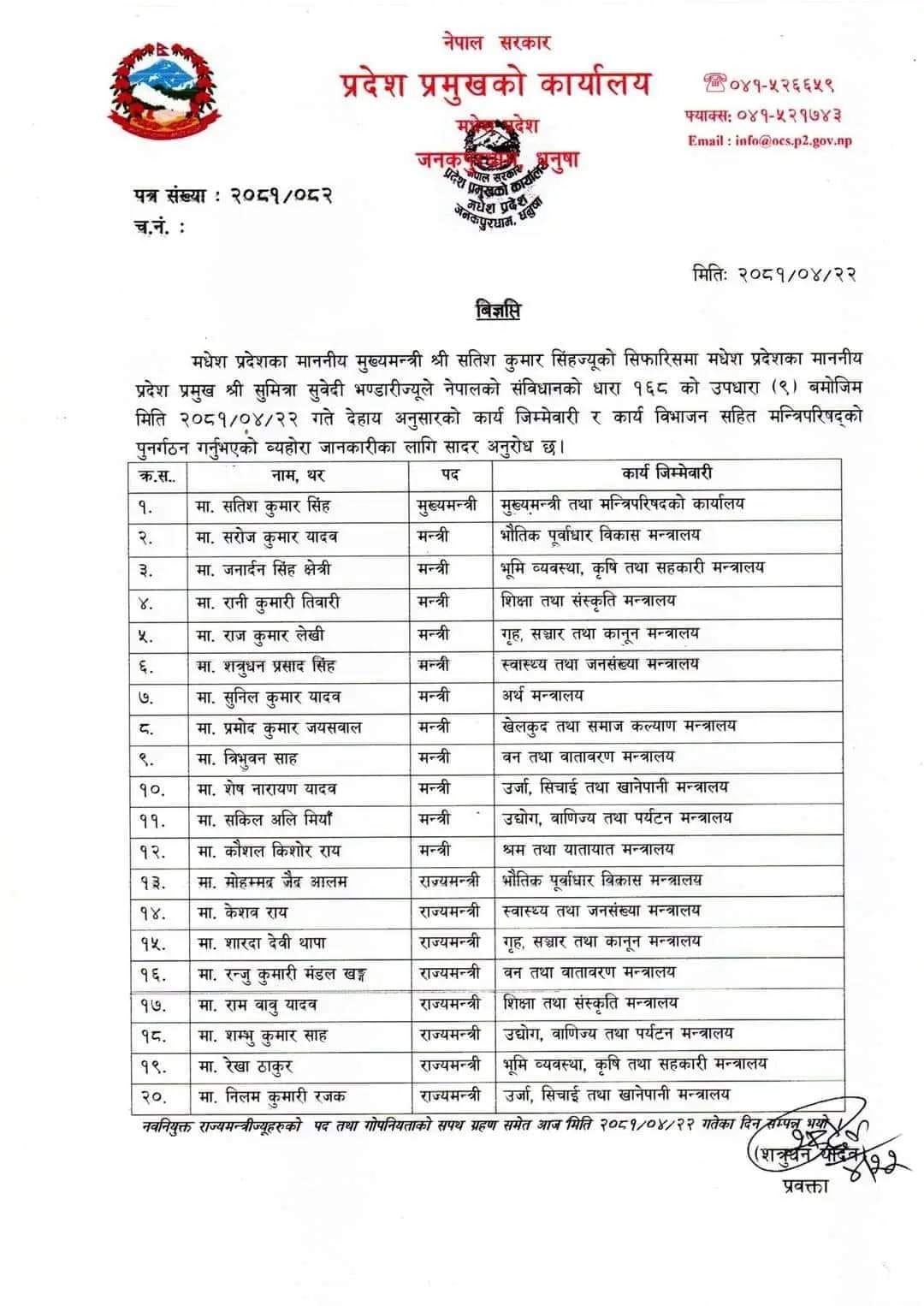 नेपाल । मधेश प्रदेशका मुख्यमन्त्री सतिशकुमार सिंहले २० सदस्यीय मन्त्रिपरिषद् बनाएर रेकर्ड कायम गरेका छन् ।