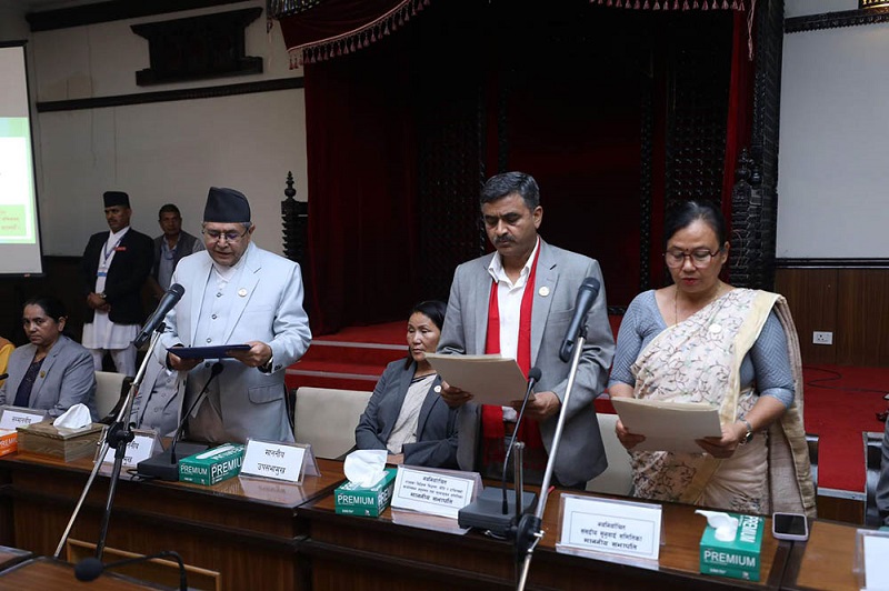 बिहीबार सिंहदरबारमा आयोजित कार्यक्रममा राज्यका निर्देशक सिद्धान्त, नीति तथा दायित्वको कार्यान्वयन अनुगमन तथा मूल्याङ्कन समितिका सभापति ठाकुरप्रसाद गैरे र संसदीय सुनुवाइ समिति सभापति ईश्वरीदेवी न्यौपानेले शपथ लिएका हुन् ।
