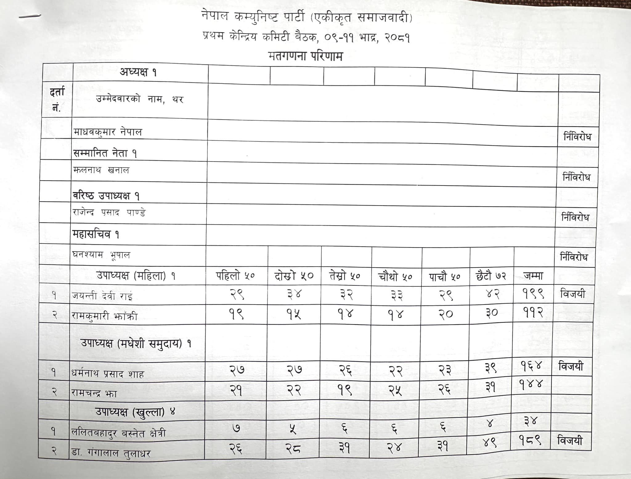 ३४४ जना केन्द्रीय सदस्य मध्ये ३२२ जनाले मतदानमा भाग लिनुभएको पार्टी निर्वाचन आयोगले जनाएको छ । महिला उपाध्यक्षमा जयन्ती देवी राई, मधेश समुदाय उपाध्यक्ष धर्मनाथप्रसाद साह, उपाध्यक्ष (खुल्ला) डा. गंगालाल तुलाधर, भानुभक्त जोशी, जगन्नाथ खतिवडा र प्रकाश ज्वाला निर्वाचित हुनुभएको छ ।