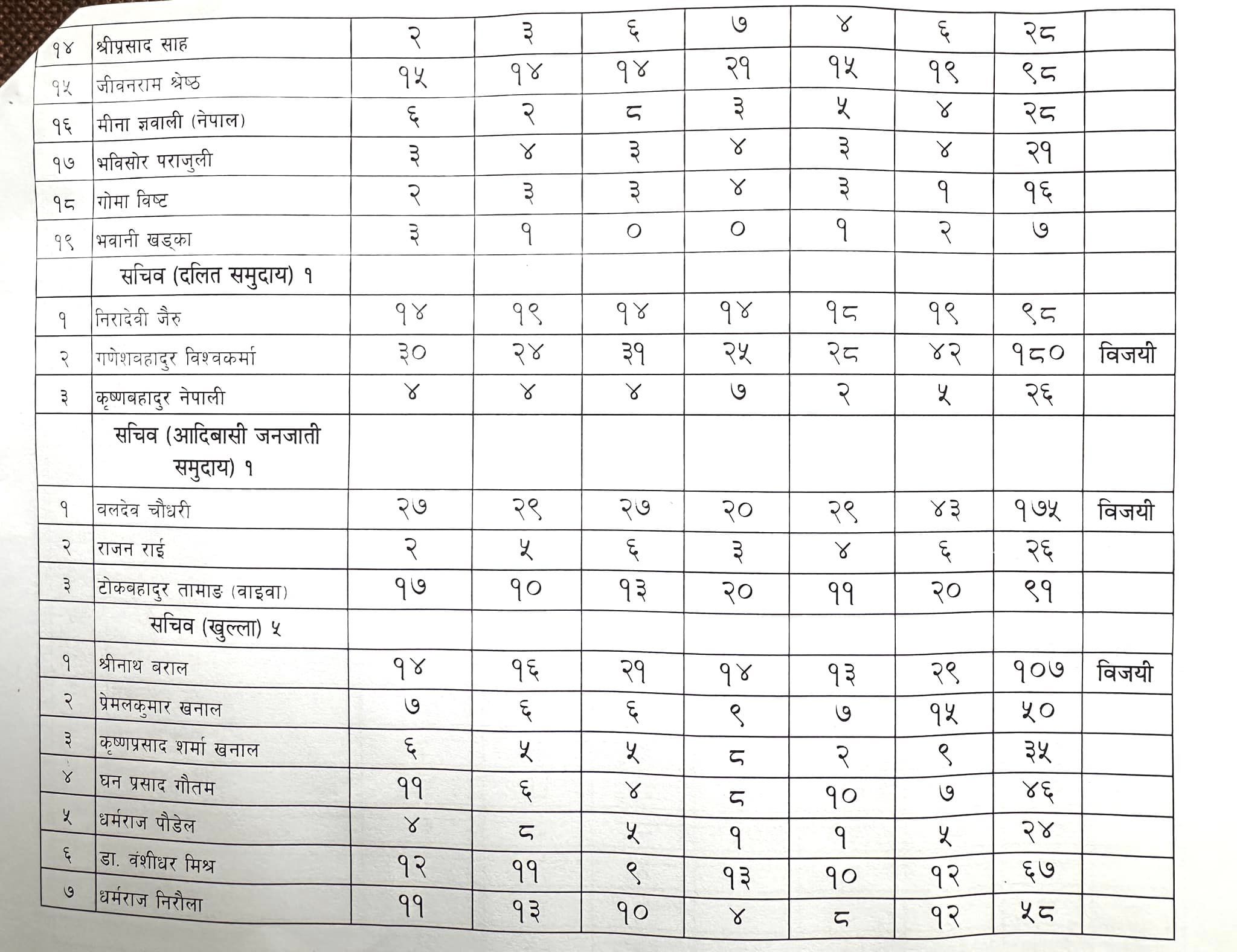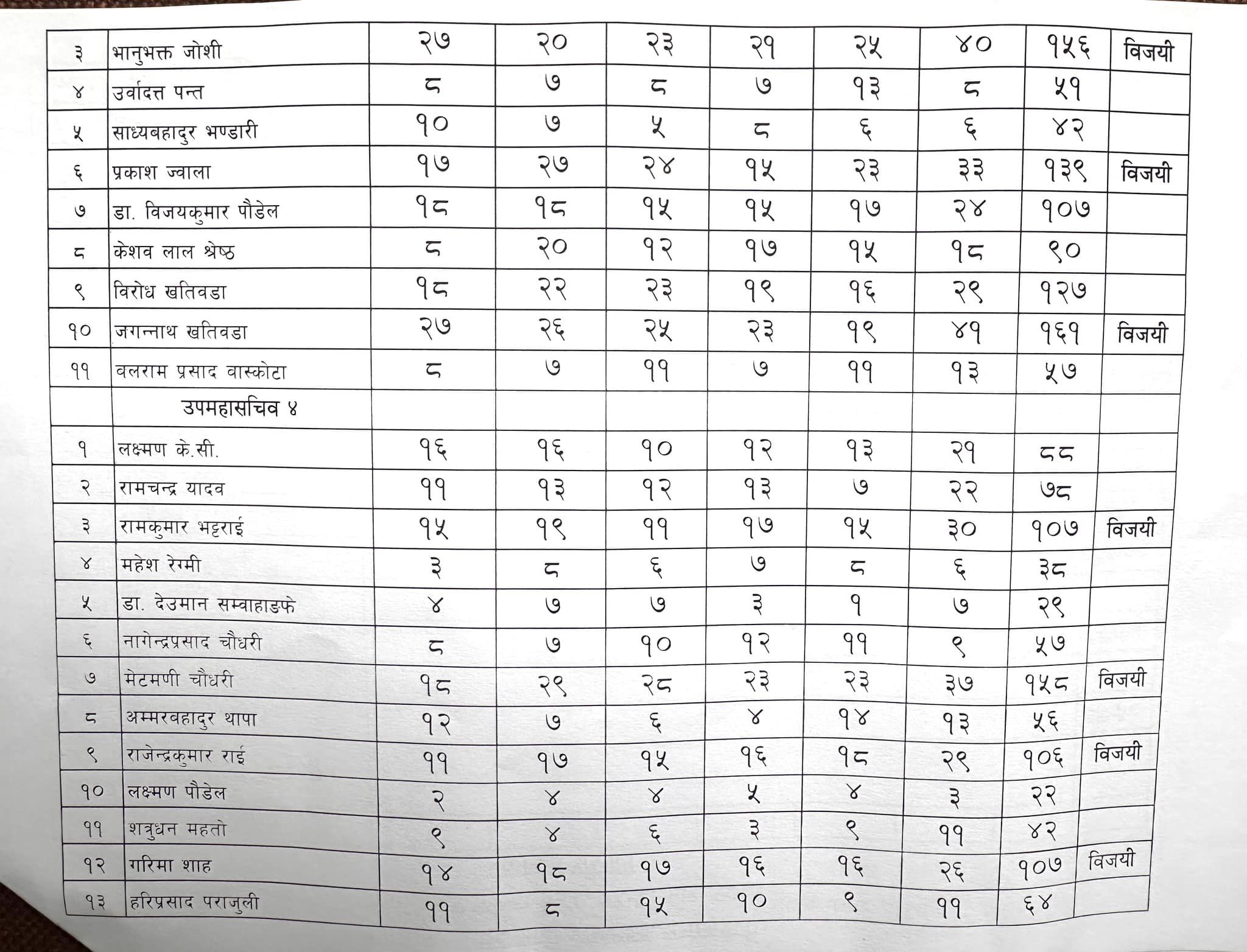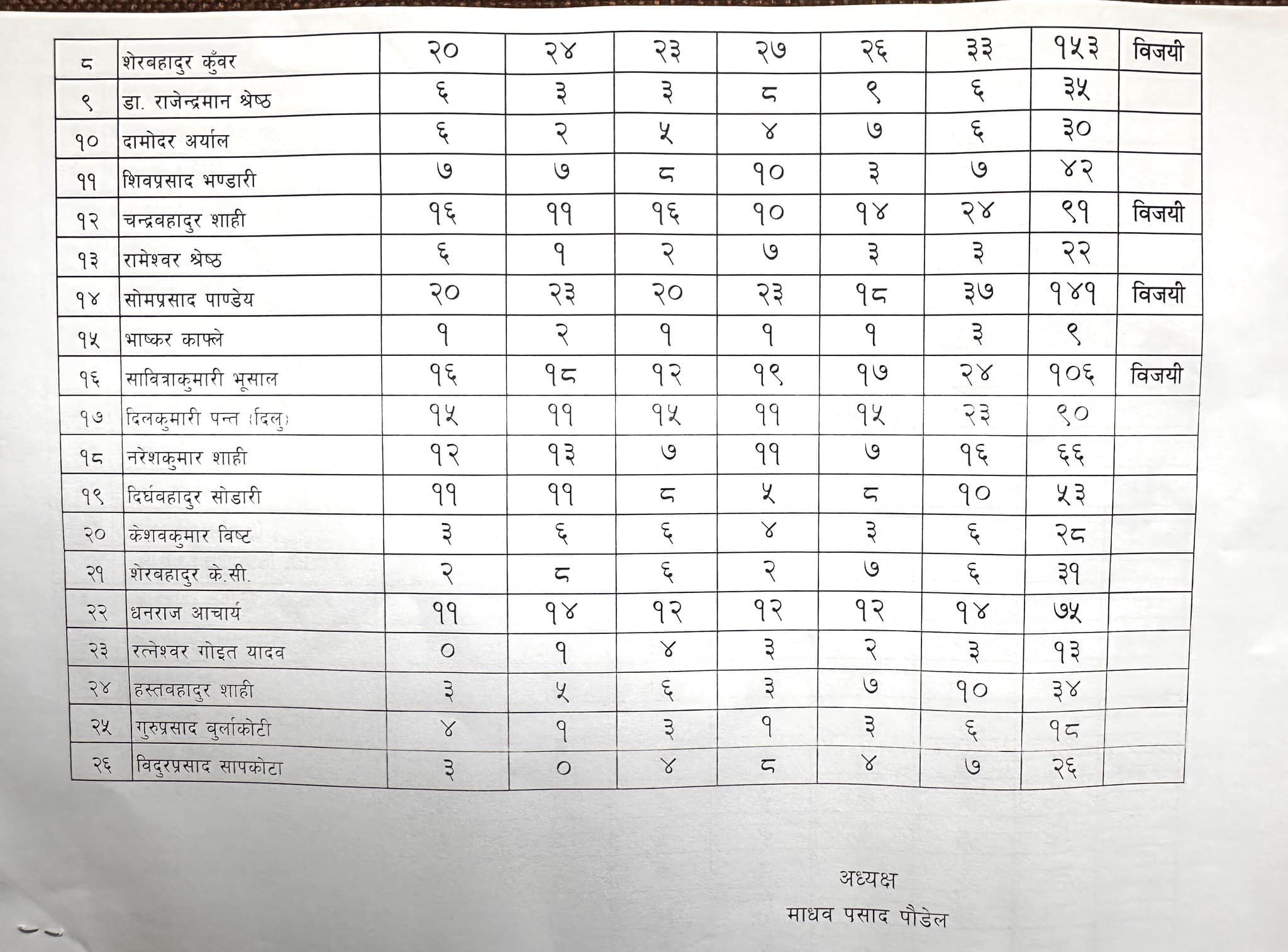 जसमा शेरबहादुर कुँवर १५३, सोमप्रसाद पाण्डे १४१, सावित्रीकुमारी भुसाल १०६, श्रीनाथ बराल १०७ र चन्द्रबहादुर शाहीले ९१ मत पाएर विजयी हुनु भएको छ ।